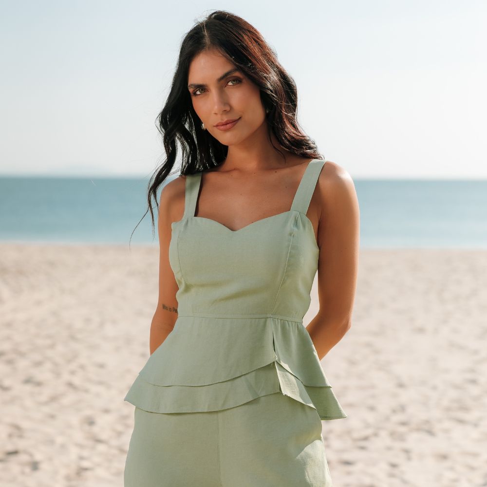 A blusa peplum traz uma silhueta marcante e elegante, com modelagem que valoriza a cintura e destaca a feminilidade. Em tecido de alfaiataria, ela garante estrutura e sofisticação, enquanto as alças finas equilibram o visual com leveza. Um modelo ideal para elevar produções do dia ou da noite.