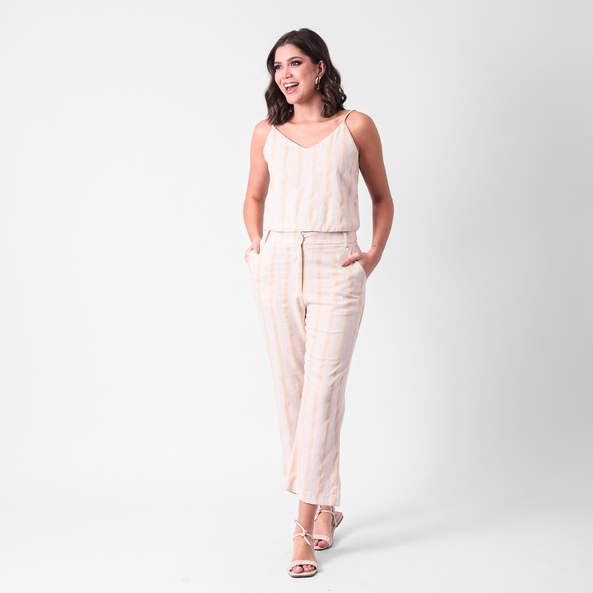 A Calça Reta Em Linho Listrado Com Bolsos Feminina combina estilo e conforto em uma peça leve e elegante. Confeccionada em linho com padronagem listrada, oferece um visual sofisticado e atemporal, ideal para compor looks casuais ou mais arrumados. A modelagem reta garante caimento perfeito, enquanto os bolsos adicionam praticidade ao dia a dia.