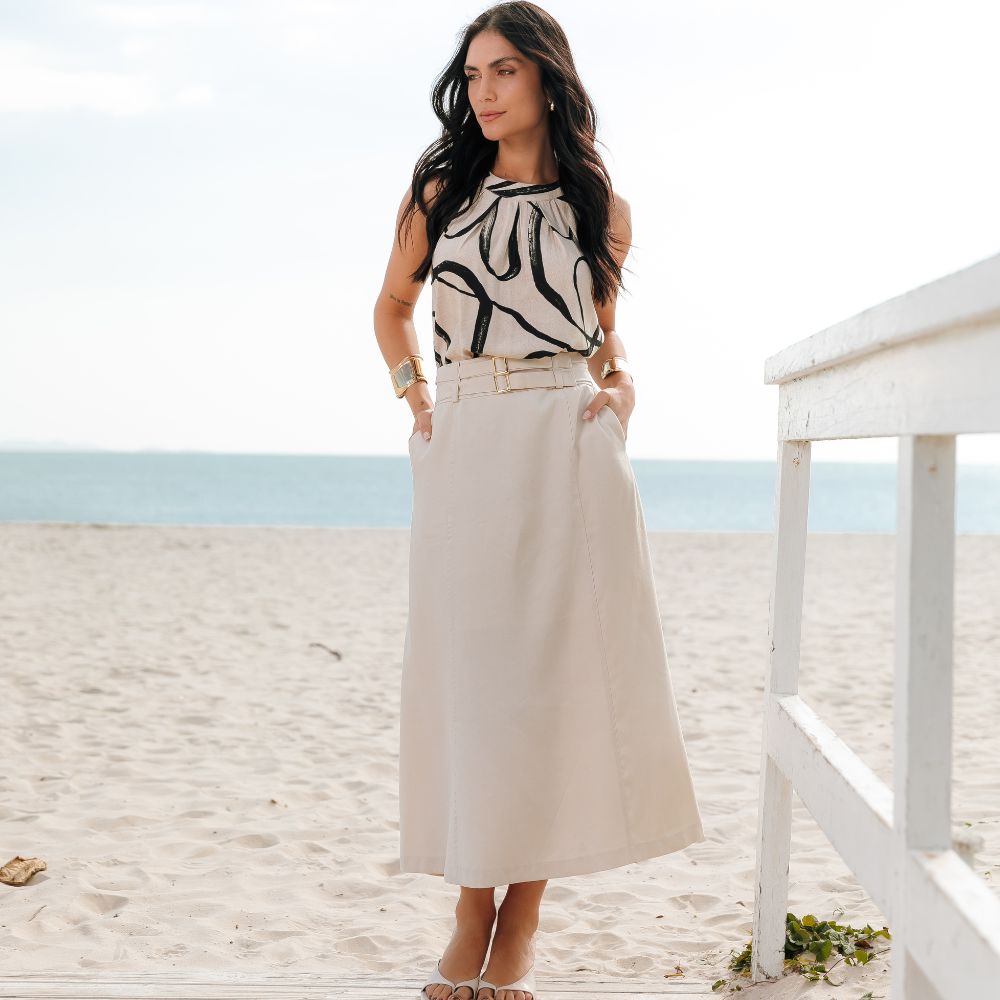 A saia midi que une estilo utilitário com um toque moderno. Confeccionada em tecido encorpado e confortável, ela traz bolsos frontais que valorizam o visual e faixas com fivela na cintura, garantindo um ajuste perfeito e um charme extra à peça.