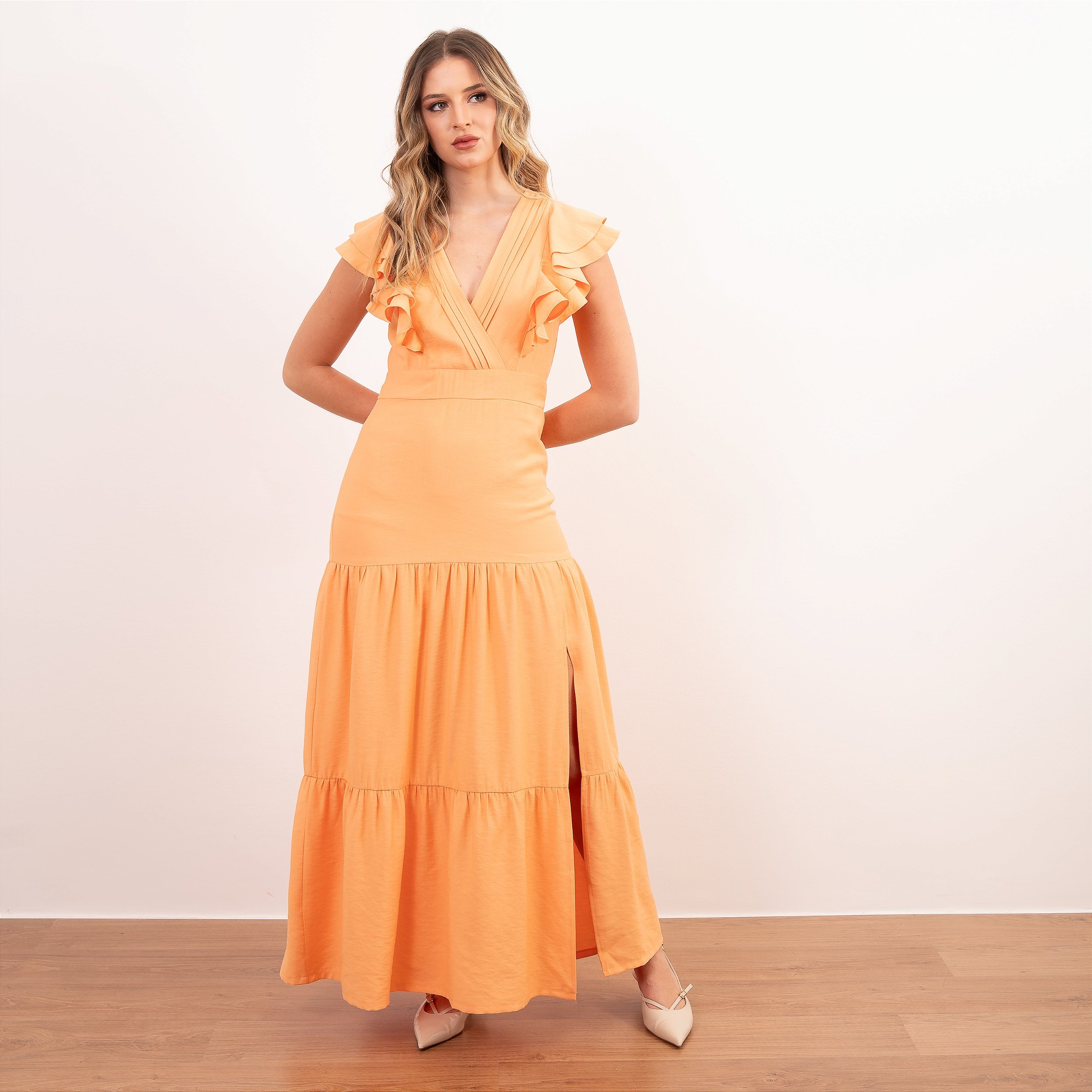 Com visual leve e marcante, esse vestido é a escolha certa para eventos especiais ou produções sofisticadas do dia a dia. O comprimento longo aliado aos babados cria movimento e feminilidade, enquanto o decote com pregas valoriza o colo com charme sutil. Um modelo que une elegância e delicadeza em cada detalhe.